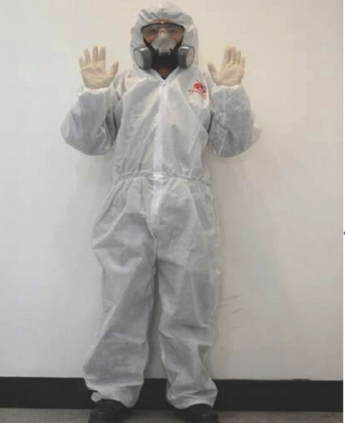 刮涂原子灰過程中,由于有毒溶劑的揮發(fā),為保護施工人員的人身安全,施工人員必須穿噴漆服、護目眼鏡、防毒面罩、無硅乳膠手套、防溶劑手套、工作鞋等。如圖2-30所示
