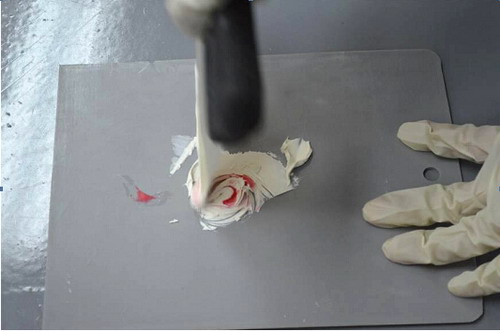 (7)如此重復地拌和,在這過程中注意觀察混合物顏色的均勻程度,直到原子灰充分拌和。如圖2-39所示。