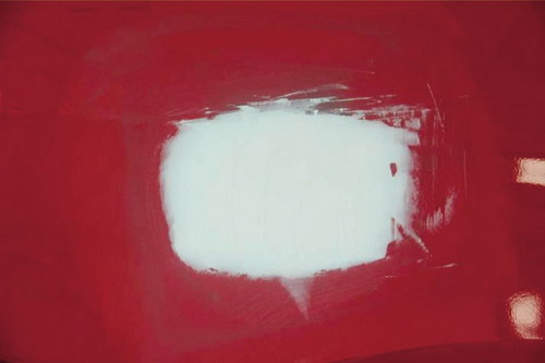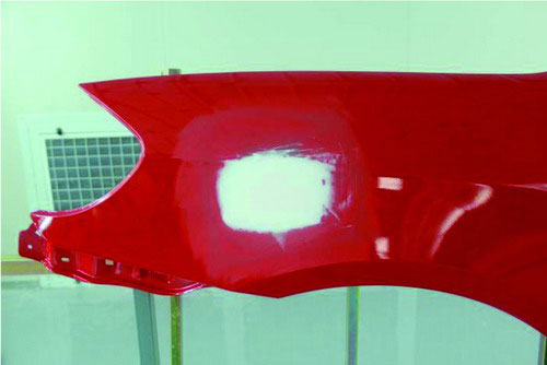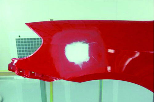 ①砂紙打磨法。在原子灰干燥過程中,可以拿80#的砂紙輕輕地打磨原子灰邊緣薄的部分,檢查原子灰是否已經(jīng)干透。如果沒有干透,則在砂紙上會粘有原子灰;如果已經(jīng)干透,則不會粘上原子灰,并在原子灰上出現(xiàn)堅硬的白色痕跡。如圖2-52所示。
