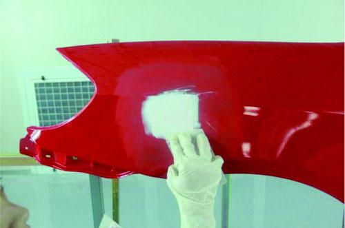 在進行原子灰刮涂之前,應先對已經(jīng)刷涂好的底漆部分進行必要的打磨及清潔。先使用菜瓜布對底漆部分進行輕微打磨,可以去掉底漆多余的那部分漆粉。再用吹塵槍進行除塵清潔,避免刮涂后的原子灰與底漆結合不牢固。如圖2-31所示。