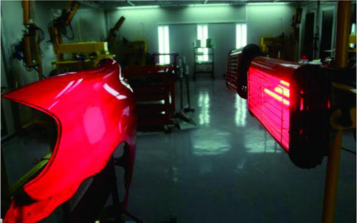 ②紅外線干燥。如果環(huán)境溫度太低或者空氣濕度太大,原子灰干燥固化速度就會減慢。為了縮短原子灰的干燥時間,可以借用干燥器或者是紅外線烤燈加熱原子灰進行干燥。一般烘烤時間設定為10min左右,在烘烤過程中,要不斷檢測板件的溫度,并檢查原子灰是否已經(jīng)干燥。如圖2-51所示。
