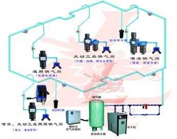 管道不生銹,不產(chǎn)生異味或有害氣體,外觀天藍色。 3)合理設計: 整個壓縮空氣主管路設計成全封閉環(huán)形,以保證各供氣點氣壓的均衡。并對主管路實行分區(qū) 分段控制 ,可在不停產(chǎn)的情況下進行檢測及維護工作。