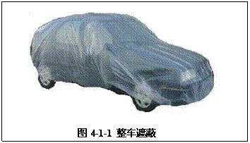 汽車修補噴涂時,為了保護修補部位以外范圍不受漆霧、灰塵的污染,因此就要對非修補區(qū)域進行覆蓋保護,這就是所謂的遮蔽。遮蔽是非常重要的工作,所有部分修補涂裝(包括點修補、點擴展修補和區(qū)域修補)在噴漆前,都要對噴涂區(qū)域周圍的區(qū)域進行遮蔽保護,修補面積較大或點較多時還需進行整車遮蔽(如圖4-1-1)。有時在清除修補區(qū)域舊涂膜的作業(yè)和研磨、拋光等作業(yè)時也需要對相關(guān)部分進行遮蔽保護。