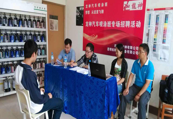 珠海龍神有限公司攜手昆明松騁汽修設備有限公司與昆明市官渡區(qū)職業(yè)高級中學建立更深層次的校企合作關系,開辦龍神噴涂班?,F場選拔面試會已于2014年6月24日在昆明市官渡區(qū)職業(yè)高級中學隆重舉行!
