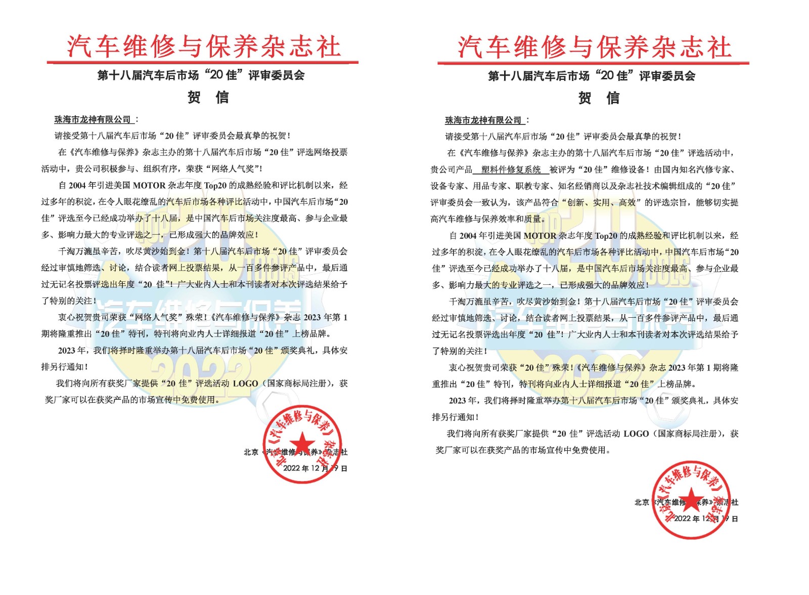 2023年2月16日,由《汽車維修與保養(yǎng)》雜志主辦的第十八屆汽車后市場“20佳”維修工具頒獎盛典在深圳舉行,在維修設備與網(wǎng)絡人氣評比活動中,龍神明星產(chǎn)品“塑料件修復系統(tǒng)”榮獲2022年度“20佳”維修設備和龍神公司榮獲2022年度“20佳”網(wǎng)絡人氣獎殊榮。